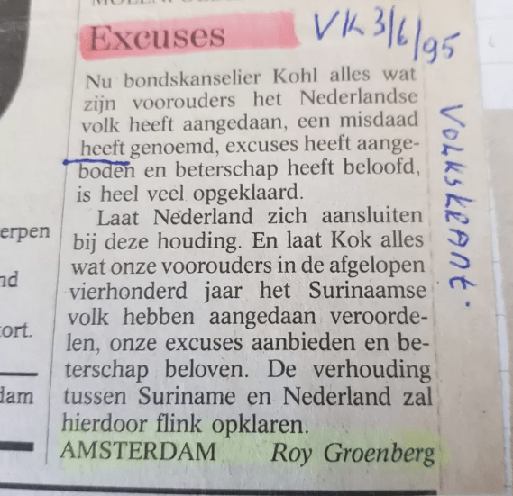 In this article, Rianne Oosterom reconstructs how the Dutch slavery past moved from the letters page (with a letter from Volkskrant reader Roy Kaikusi Groenberg) to the front page of the public debate. Recently, the Dutch cabinet announced that it will offer formal apologies for the role of The Netherlands in the slavery past. Nicole Immler provided Oosterom with commentary on this decision.