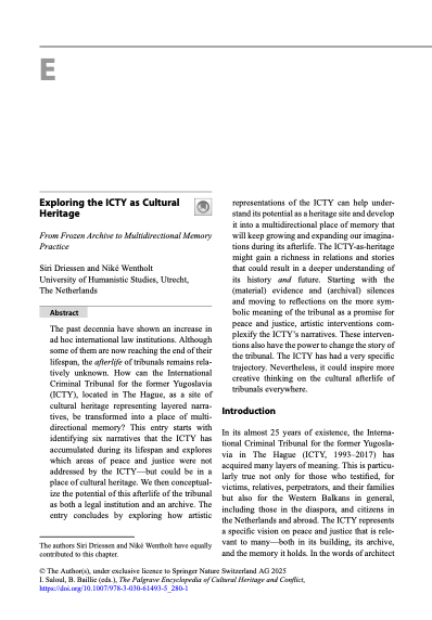 Driessen, Siri, and Niké Wentholt. “Exploring the ICTY as Cultural Heritage: From Frozen Archive to Multidirectional Memory Practice.” In The Palgrave Encyclopedia of Cultural Heritage and Conflict, pp. 1-11. Cham: Springer Nature Switzerland, 2025.
