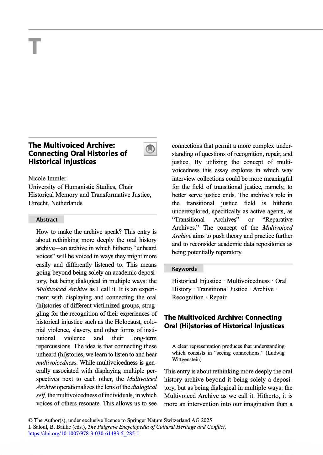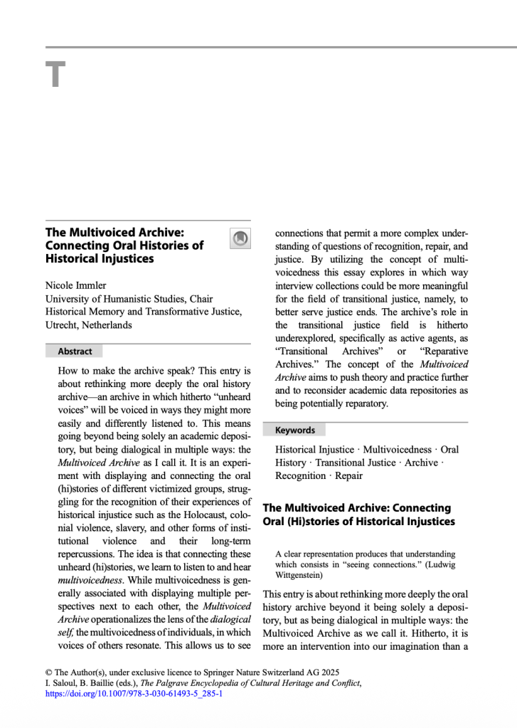 How to make the archive speak? This entry by Nicole Immler is about rethinking more deeply the oral history archive—an archive in which hitherto “unheard voices” will be voiced in ways they might more easily and differently listened to. This means going beyond being solely an academic depository, but being dialogical in multiple ways: the Multivoiced Archive as I call it. It is an experiment with displaying and connecting the oral (hi)stories of different victimized groups, struggling for the recognition of their experiences of historical injustice such as the Holocaust, colonial violence, slavery, and other forms of institutional violence and their long-term repercussions. The idea is that connecting these unheard (hi)stories, we learn to listen to and hear multivoicedness. While multivoicedness is generally associated with displaying multiple perspectives next to each other, the Multivoiced Archive operationalizes the lens of the dialogical self, the multivoicedness of individuals, in which voices of others resonate. This allows us to see connections that permit a more complex understanding of questions of recognition, repair, and justice. By utilizing the concept of multivoicedness this essay explores in which way interview collections could be more meaningful for the field of transitional justice, namely, to better serve justice ends. The archive’s role in the transitional justice field is hitherto underexplored, specifically as active agents, as “Transitional Archives” or “Reparative Archives.” The concept of the Multivoiced Archive aims to push theory and practice further and to reconsider academic data repositories as being potentially reparatory.