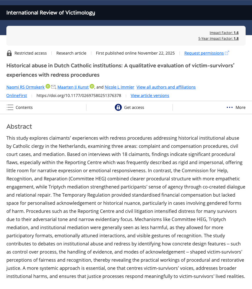 In this study Naomi RS Ormskerk, Maarten JJ Kunst and Nicole L Immler explore claimants’ experiences with redress procedures addressing historical institutional abuse by Catholic clergy in the Netherlands, examining three areas: complaint and compensation procedures, civil court cases, and mediation. Based on interviews with 18 claimants, findings indicate significant procedural flaws, especially within the Reporting Centre which was frequently described as rigid and impersonal, offering little room for narrative expression or emotional responsiveness. In contrast, the Commission for Help, Recognition, and Reparation (Committee HEG) combined clearer procedural structure with more empathetic engagement, while Triptych mediation strengthened participants’ sense of agency through co-created dialogue and relational repair. The Temporary Regulation provided standardised financial compensation but lacked space for personalised acknowledgement or historical nuance, particularly in cases involving gendered forms of harm. Procedures such as the Reporting Centre and civil litigation intensified distress for many survivors due to their adversarial tone and narrow evidentiary focus. Mechanisms like Committee HEG, Triptych mediation, and institutional mediation were generally seen as less harmful, as they allowed for more participatory formats, emotionally attuned interactions, and visible gestures of recognition. The study contributes to debates on institutional abuse and redress by identifying how concrete design features – such as control over process, the handling of evidence, and modes of acknowledgement – shaped victim-survivors’ perceptions of fairness and recognition, thereby revealing the practical workings of procedural and restorative justice. A more systemic approach is essential, one that centres victim-survivors’ voices, addresses broader institutional harms, and ensures that justice processes respond meaningfully to victim-survivors’ lived realities.