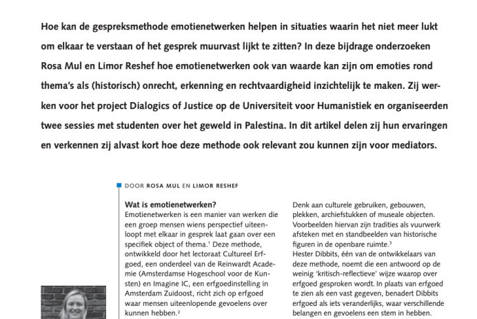 How can the conversational method of emotion networking help in situations where mutual understanding is no longer possible or the conversation seems to be stuck? In this article, Rosa Mul and Limor Reshef explore how emotion networking can also be valuable in providing insight into emotions surrounding themes such as (historical) injustice, recognition, and justice. They organized two sessions with students at the UvH on the genocide in Palestine and share their insights.