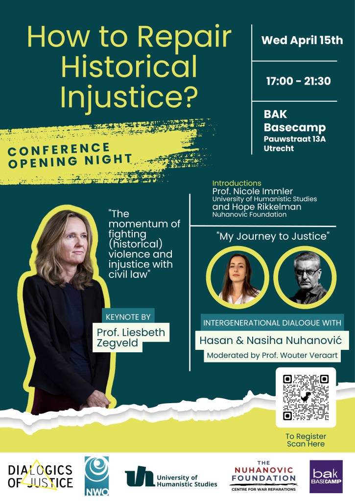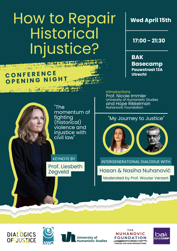 Join us for our kick-off public event on April 15th at BAK Basecamp, with human rights advocate Liesbeth Zegveld as our keynote speaker. Hasan Nuhanović, who together with Zegveld held the Dutch state liable for the killing of his family during the Srebrenica genocide, and his daughter Nasiha will then share their expertise and experience on the lived and transgenerational impact of court cases. On the 16th and 17th the conference will continue at the University of Humanistic Studies (see the programme for details).