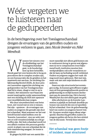 In the reporting on the Child Benefit Affair, the experiences of the affected parents and young people are in danger of being lost, according to Nicole Immler and Niké Wentholt.